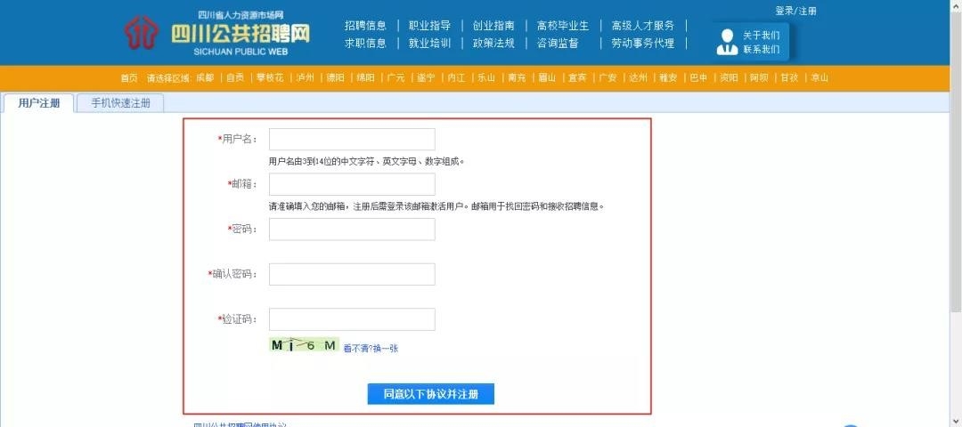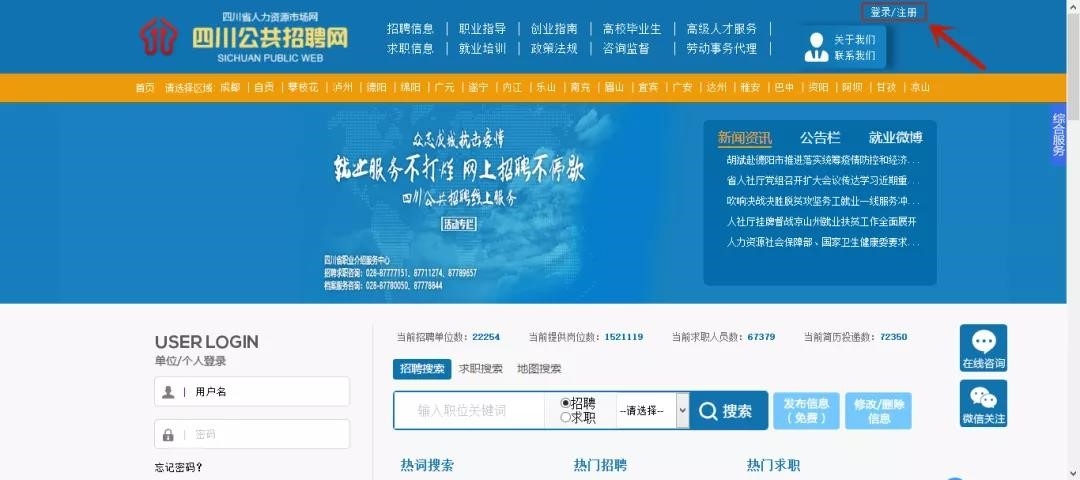 1.登錄四川公共招聘網(wǎng)(http://www.sc91.org.cn),點(diǎn)擊首頁(yè)“注冊(cè)”。