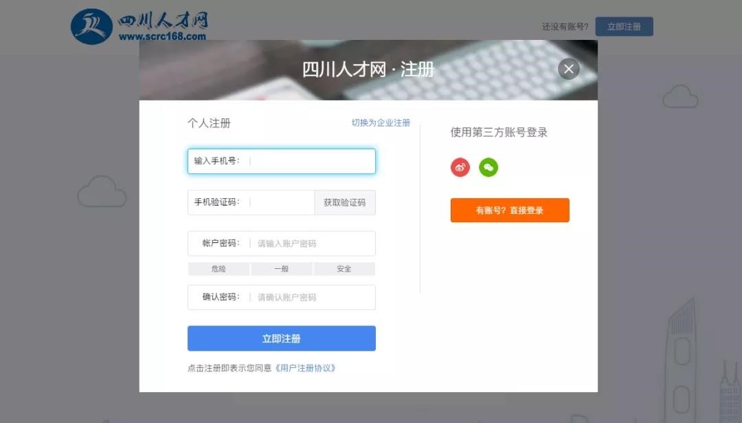 第一步,登錄注冊(cè):電腦或手機(jī)瀏覽器輸入網(wǎng)址:www.scrc168.com,進(jìn)入網(wǎng)站首頁(yè),點(diǎn)擊頁(yè)面的【立即注冊(cè)】,選擇個(gè)人注冊(cè),完善賬號(hào)信息。如下圖所示: