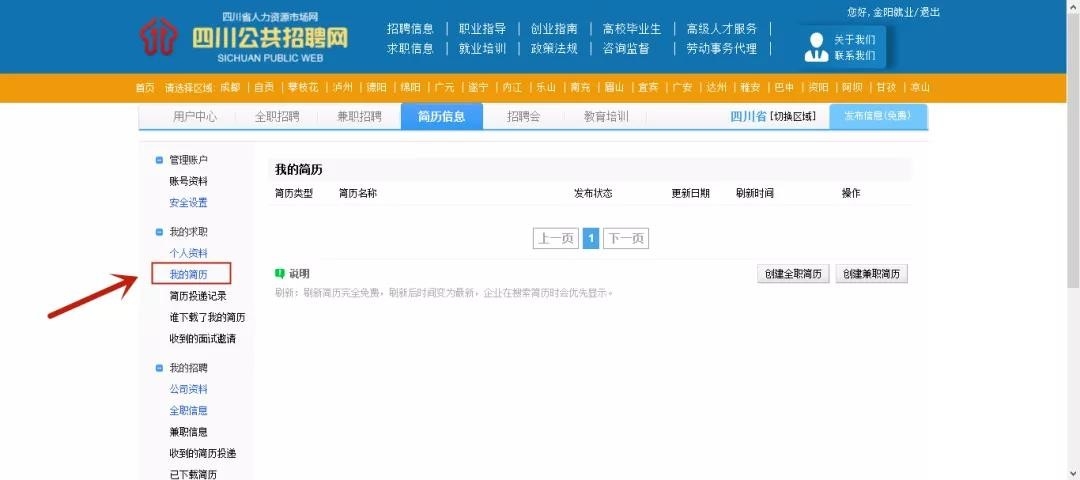 4.個(gè)人資料填寫完成后,點(diǎn)擊左側(cè)菜單【我的求職】→【我的簡(jiǎn)歷】,在右側(cè)頁(yè)面中創(chuàng)建簡(jiǎn)歷,完善簡(jiǎn)歷信息后等待網(wǎng)站經(jīng)辦人員審核簡(jiǎn)歷。