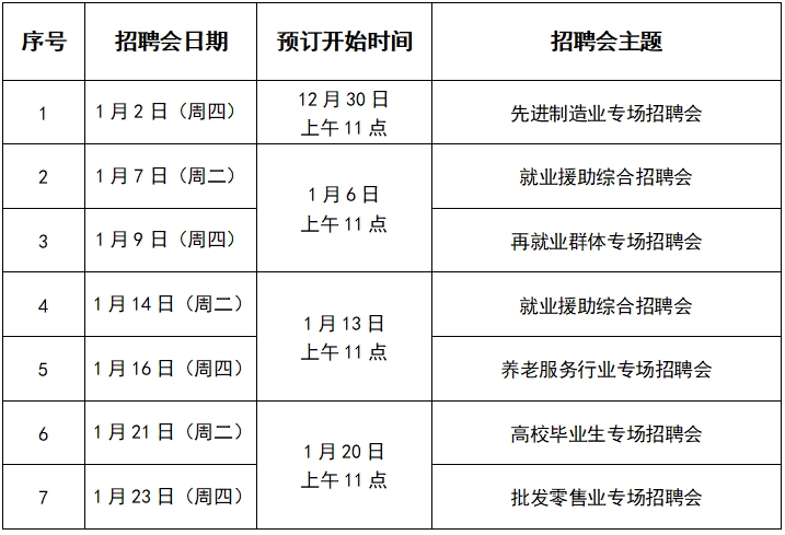 一、招聘會時間:每周一上午11點開始網(wǎng)上預(yù)定當(dāng)周招聘會;每周二、四上午9:00-12:00舉辦(節(jié)假日除外);單位入場時間:8:50-9:30,逾時展位自動取消。
